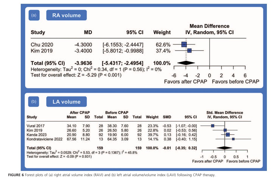 Foi observado também um remodelamento reverso do AD através da redução do volume indexado (MD -3.96; 95%IC: -5.43 até -2.50; P < 0.001; I² = 0%). Por outro lado, o volume do AE não mostrou diferença significativa após o tratamento com CPAP (SMD -0.01; 95%IC: -0.35 até 0.32; P = 0.93; I² = 46%).