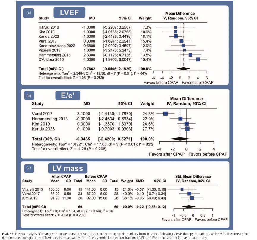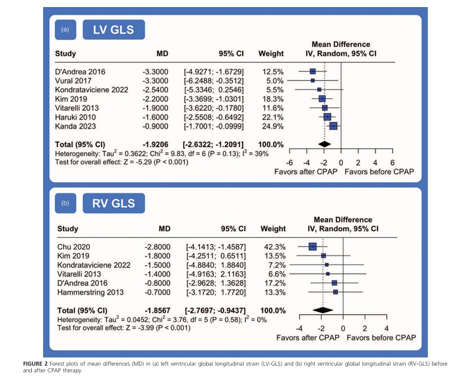 O uso de CPAP se associou com uma melhora significativa no SGL do VE comparando com a avaliação de base (MD -1.92; 95%IC: -2.63 até -1.21; P < 0.01; I² = 39%), bem como do strain global do VD (MD -1.88; 95%IC: -2.77 até -0.99; P < 0.01; I² = 0%), indicando uma melhora significativa pós-tratamento da função ventricular (SGL VE com ↑ ~ 2.0% e SGL VD com ↑ ~ 1.9%) .