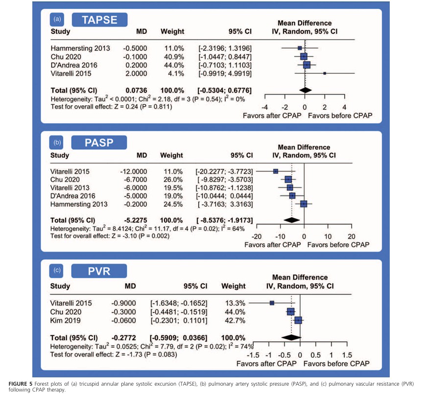 Houve uma redução significativa do PSAP após a terapia com CPAP (MD -5.2275; 95%IC: -8.5376 até -1.9173; P = 0.002; I² = 64%).