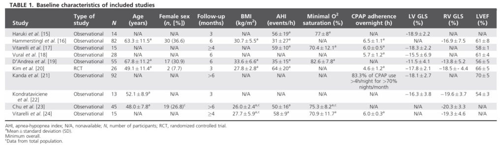 Os critérios de elegibilidade dos estudos incluíram (1) utilização da avaliação do ventrículo esquerdo (VE) e do ventrículo direito (VD) pelo strain longitudinal, (2) pacientes com AOS e com ≥ 18 anos de idade, (3) análise do strain antes e após a terapia com CPAP e (4) pelo menos um evento adverso de interesse.