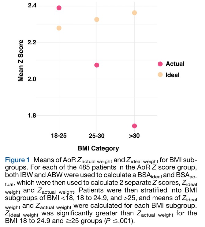 Assim, a indexação da aorta para o peso ideal em pacientes com sobrepeso tem a capacidade de reclassificar um número significativo de pacientes de “normal” para “aumentado“, com impactos potenciais no seguimento/manejo desses pacientes.