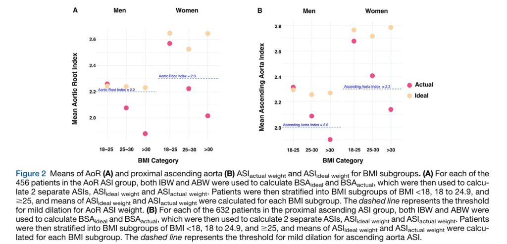 Para a análise da aorta ascendente pelo índice aórtico, 632 pacientes (505 homens, 127 mulheres) preencheram os critérios de inclusão, com 473 pacientes (74%) apresentando IMC ≥ 25. Quando indexado para o peso ideal, 86% dos pacientes com valores (indexados) normais de aorta ascendente foram reclassificados para pelo menos “aumento leve” (P<0.001), definido como ≥ 2,0 cm/m² para homens e ≥ 2.3 cm/m² para mulheres.