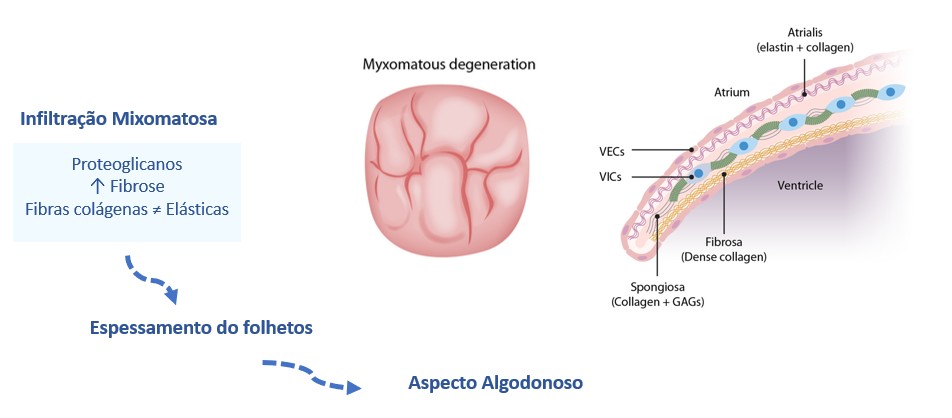 Assim, ocorre espessamento dos folhetos pela infiltração mixomatosa, mas também pela formação de tecido fibroso na face atrial, como também na face ventricular do folheto, porém em menor intensidade neste. É interessante destacar que o tecido fibroso que se forma a partir da degeneração mixomatosa fica localizado no topo do tecido original do folheto valvar.