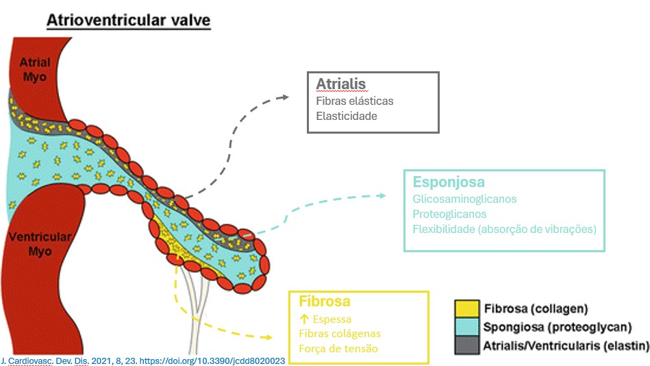 Por último, a camada fibrosa, voltada para a cavidade ventricular, é a parte mais grossa do folheto e rica em fibras colágenas que conferem força de tensão à valva.