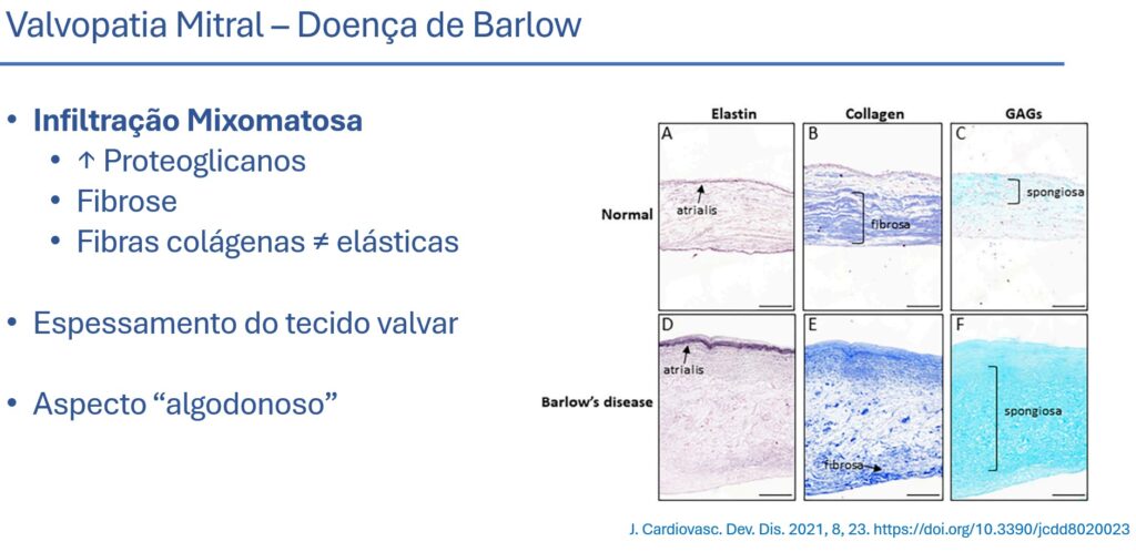 Quando comparado com a deficiência fibroelástica, que também apresenta certo grau de degeneração mixomatosa pela análise histológica, a doença de Barlow apresenta de forma bem mais acentuada a desorganização das fibras colágenas, bem como um grau mais intenso de infiltração mixomatosa.