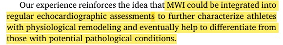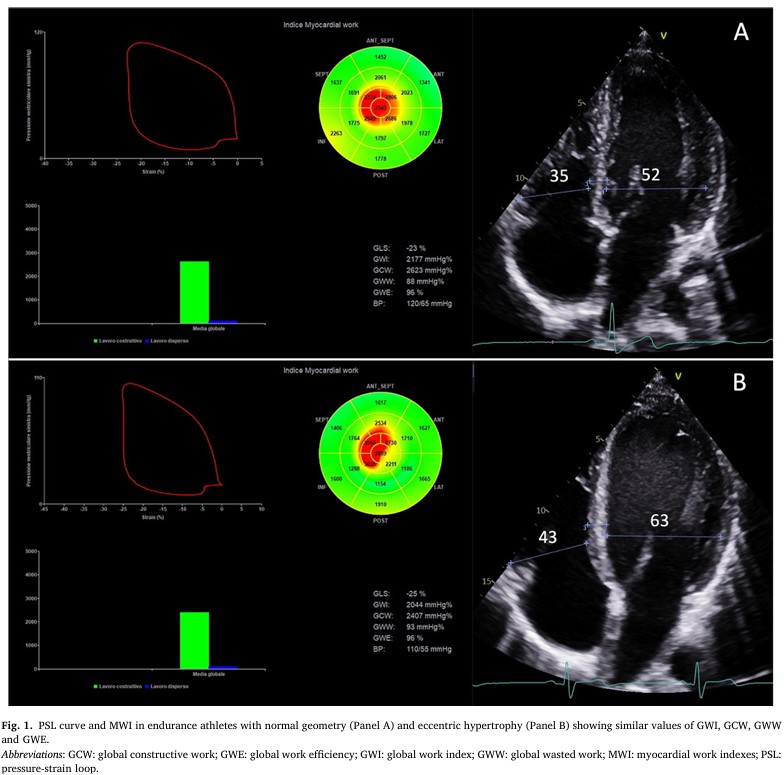 Assim sendo, além de confirmar a natureza fisiológica das alterações estruturais induzidas pela atividade física em atletas de endurance, o trabalho miocárdico pode auxiliar não só na diferenciação entre adaptação e doença (valores normais sugerem fortemente um fenômeno benigno enquanto que parâmetros alterados podem sugerir uma condição patológica), mas também fornecer informações sobre treinabilidade.