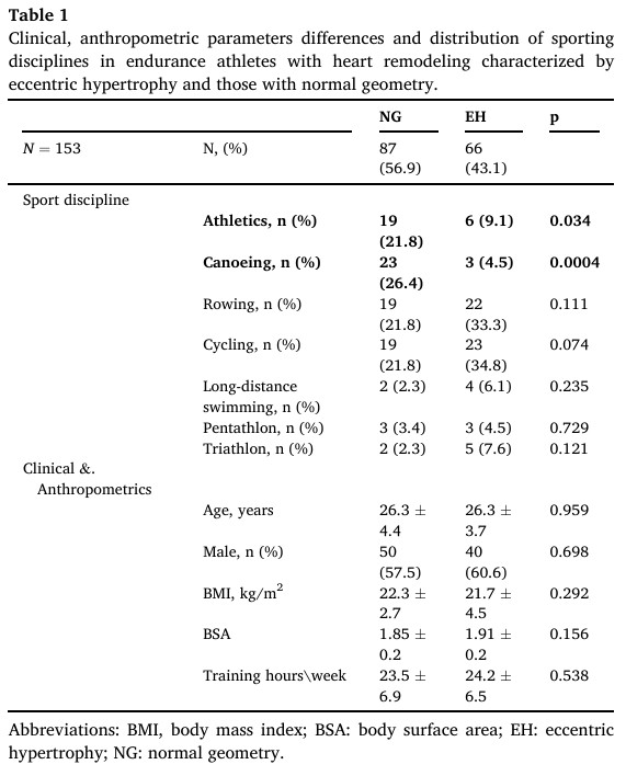 A única diferença foi que a prevalência de geometria ventricular esquerda normal foi maior entre os praticantes de atletismo e de canoeing. Por outro lado, uma prevalência maior, porém não significativa, de HVE excêntrica foi observada entre os ciclistas.