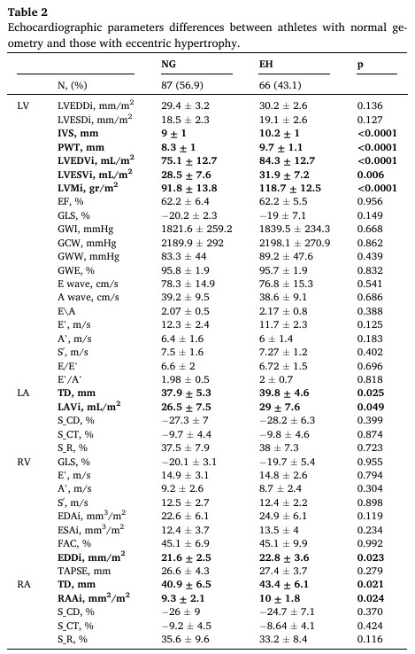 Aqueles com hipertrofia (HVE) excêntrica tinham idade semelhante comparados com aqueles com geometria normal, bem como a prevalência entre gêneros (60.6% homens com HVE excêntrica x 57.5% homens com geometria ventricular normal, p = 0.698). Ainda, o volume de treino foi parecido entre esses atletas (24.2 ± 6.5 h/semana x 23.5 ± 6.9 h/semana).