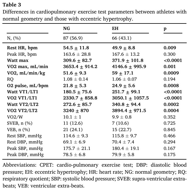 Quanto ao teste cardiopulmonar, os atletas com HVE excêntrica tinham uma frequência cardíaca (FC) de repouso menor, maiores picos de exercício (expressos em watts) e maiores VO2 (+ 12.5%), assim como o pulso de O2. Tais achados sugerem uma maior capacidade funcional entre aqueles atletas que apresentam remodelamento adaptativo.