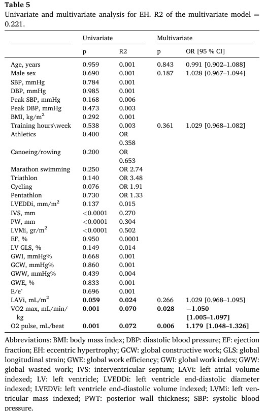Já as análises uni e multivariada foram realizadas para determinar os parâmetros independentemente associados à HVE excêntrica, com o VO2 máximo (p = 0.028, OR 1.050 [C.I. 1.005–1.097]) e pulso de O2 (p =0.006, OR 1.179 [C.I. 1.048–1.326]) mostrando poder estatístico.