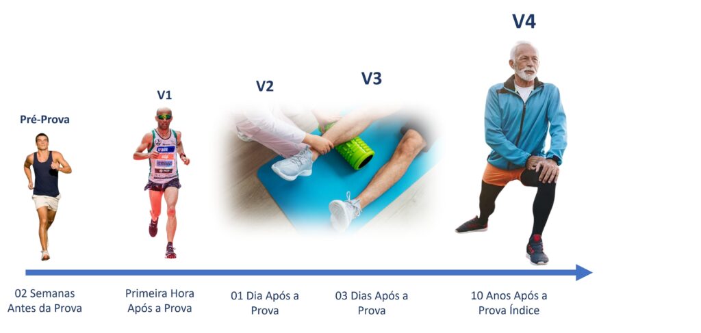 As avaliações foram realizadas (1) duas semanas antes da maratona em 2009 (pré-prova), (2) na primeira hora após o término da prova (pós-prova V1), (3) um dia após o término da prova (pós-prova V2), (4) três dias depois da prova (pós-prova V3) e (5) 10 anos após a maratona índice (pós-prova V4).