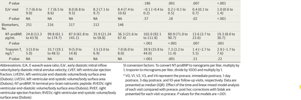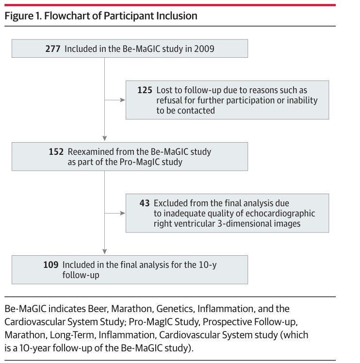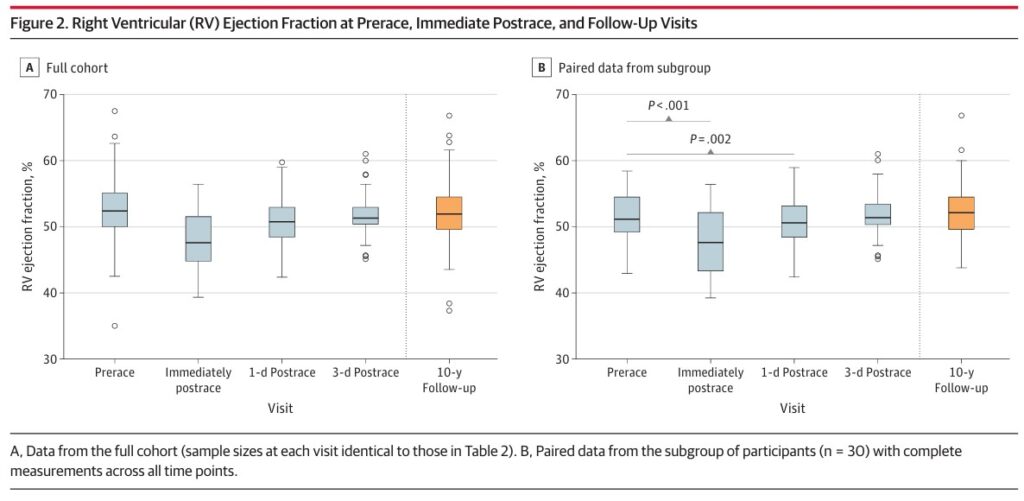 O ponto principal do estudo foi a associação entre o aumento agudo de troponina induzida pela atividade física de alta intensidade e alteração da função sistólica do ventrículo direito (VD) desde a avaliação antes da prova até o término de seguimento após 10 anos. Desfechos secundários incluíram (1) alterações geométricas (volumes sistólico e diastólico finais) e funcionais do VD, (2) associação entre as alterações agudas na função sistólica do VD e fatores de risco cardiovascular, alterações laboratoriais e histórico de treinamento, (3) alterações no ventrículo esquerdo (fração de ejeção, volume diastólico final, volume sistólico final, relação E/A e relação E/e´) e (4) alterações de troponina entre pré-prova e V1 e ao término do seguimento de 10 anos.