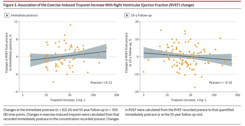 Após 10 anos, o aumento de troponina induzida durante a maratona em 2009 não se associou de forma significativa com as alterações, tanto da fração de ejeção do VD quando da do VE, comparando o pré-prova e o seguimento de 10 anos (n = 101: Pearson r = -0.10, P = 0.35 e Pearson r = -0.09, P = 0.35, respectivamente).