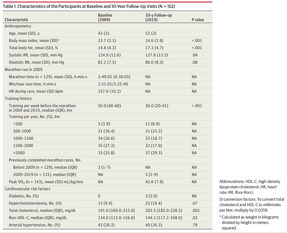 Não foram documentos eventos cardíacos adversos durante a maratona de Munich em 2009 (maratona índice). Hipertensão arterial induzida pela atividade física foi o achado cardiovascular mais comum durante o seguimento de 10 anos (61.8% dos participantes), seguido de extrassístoles ventriculares (40.8%). Dilatação do átrio esquerdo foi observada em 45.4% dos participantes e dilatação de aorta, em 9.2%.