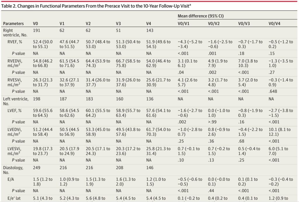 Uma fração de ejeção do VD < 45% foi observada em 5 participantes (3.3%), dos quais 3 tinham uma fração de ejeção de 44%. Um deles com FE de 44% apresentou maior taxa de arritmia induzida pela atividade física (ventricular ou supraventricular) após 10 anos de seguimento. Este participante específico tinha ponte miocárdica na artéria descendente anterior e precisou realizar isolamento de veias pulmonares em razão da presença de flutter atrial e fibrilação atrial.