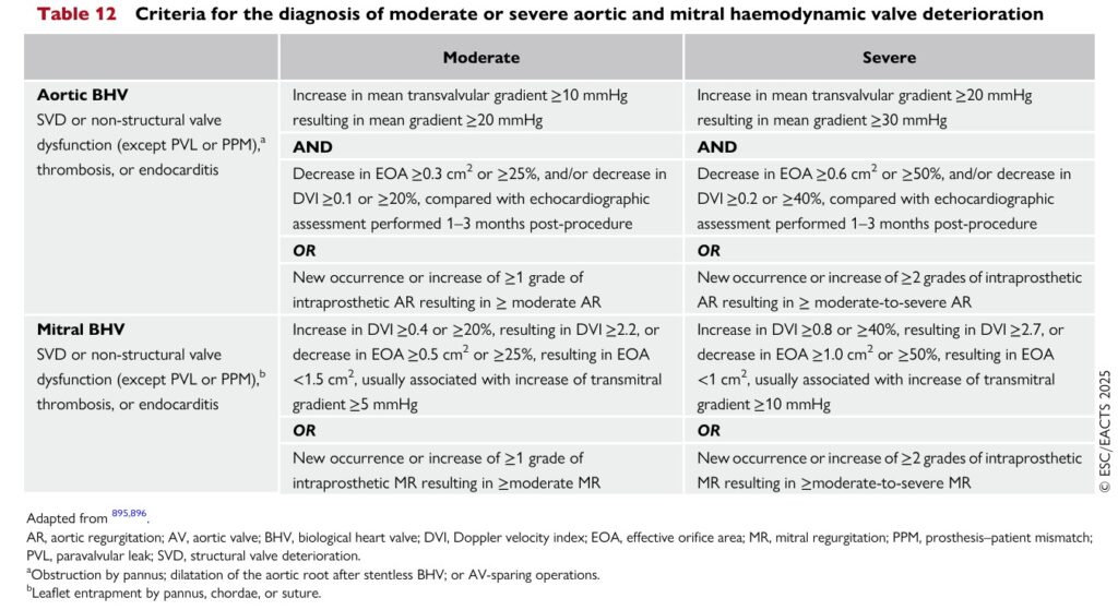 Os critérios para disfunção por dano estrutural tanto para próteses biológicas aórticas quanto para biopróteses mitrais estão listados na tabela a seguir: