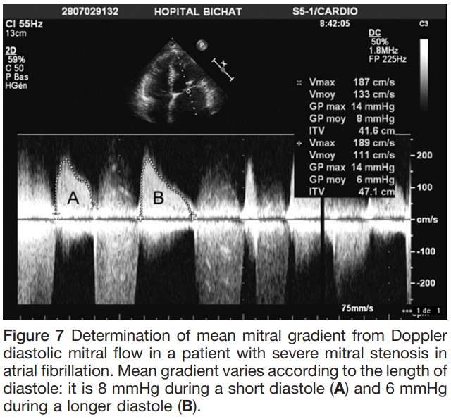 Aqui, o gradiente médio (Gmed) é o parâmetros hemodinâmico mais relevante, uma vez que o gradiente de pico deriva da velocidade de pico e sofre influência direta da complacência atrial e função diastólica do ventrículo esquerdo (VE).