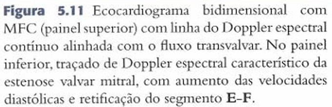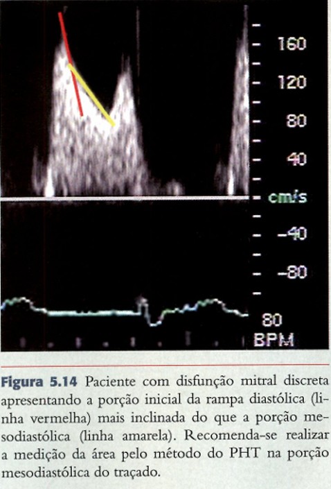 Em pacientes com ritmo regular pode ser utilizado a medida do tempo em que o gradiente pressórico transmitral cai pela metade.