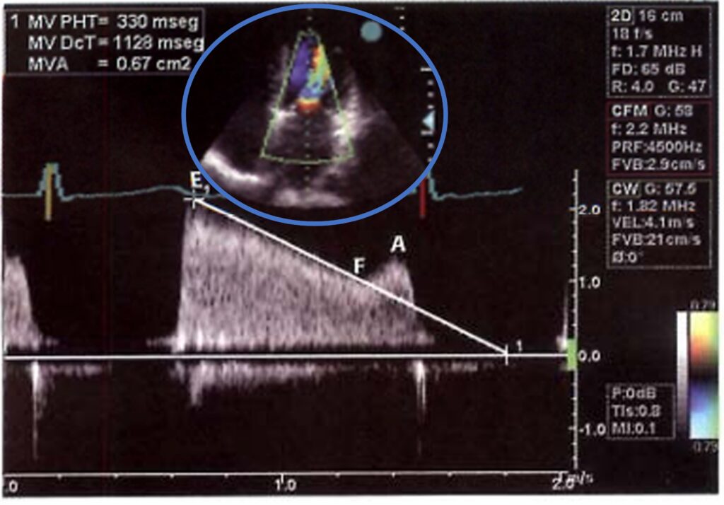 Depois, no traçado espectral do fluxo mitral, mede-se a velocidade integral. A partir daí, podemos calcular a área valvar através da fórmula “Área Valvar Mitral = débito sistólico / VTI mitral“.