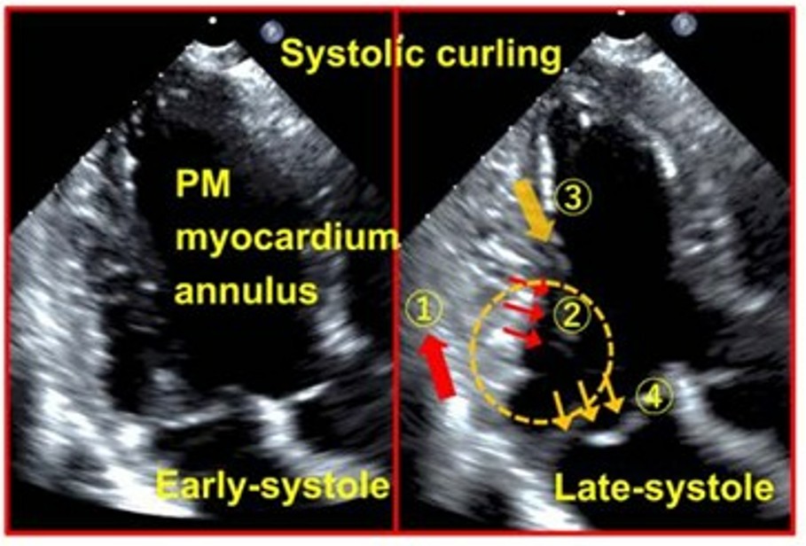 O curling consiste numa mobilidade exagerada do anel mitral posterior seguida de uma incursão miocárdica no segmento basal da parede ínfero lateral associado a um deslocamento superior do folheto posterior.
