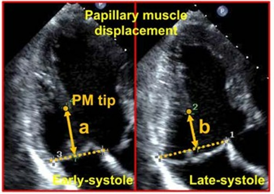 O deslocamento do músculo papilar foi medido pela variação da distância entre a ponta do mesmo e o plano do anel valvar mitral no início e no final da sístole ventricular.