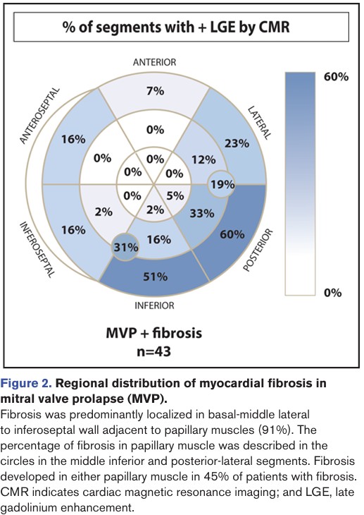 Fibrose miocárdica foi identificada, pela técnica de realce tardio, em 43 pacientes com PVM (38%), com localização predominante nos segmentos basal e médio da parede ínfero lateral ou nos músculos papilares.