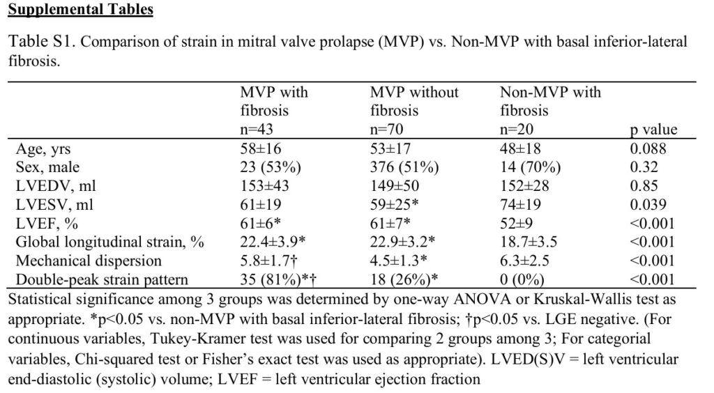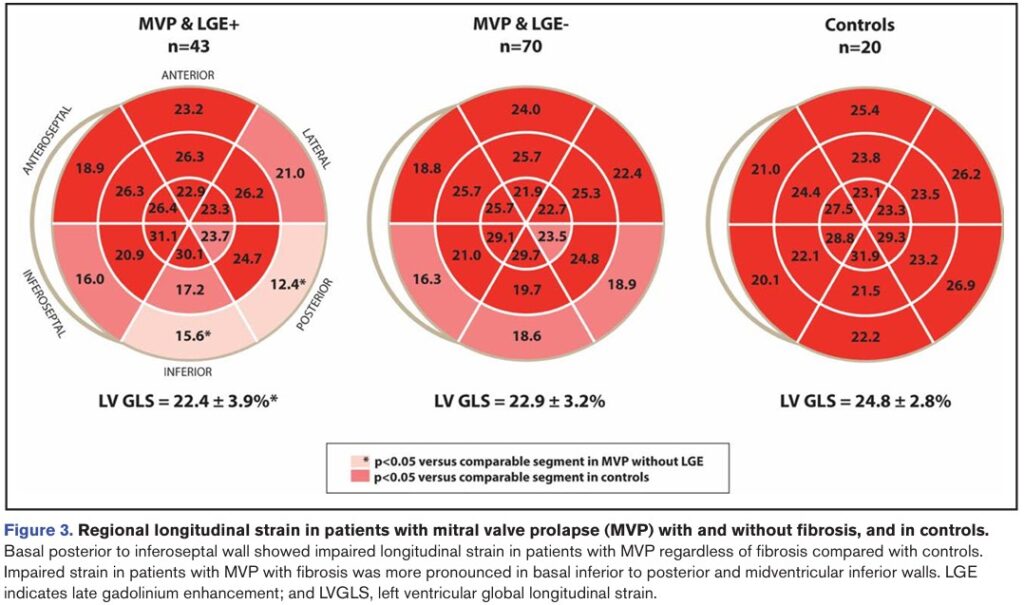 Comparando pacientes com PVM com e sem fibrose miocárdica, as idades, sexo, volumes do VE, FE, espessura diastólica basal e média do VE, SGL e prevalência de prolapso de ambos os folhetos foram similares.