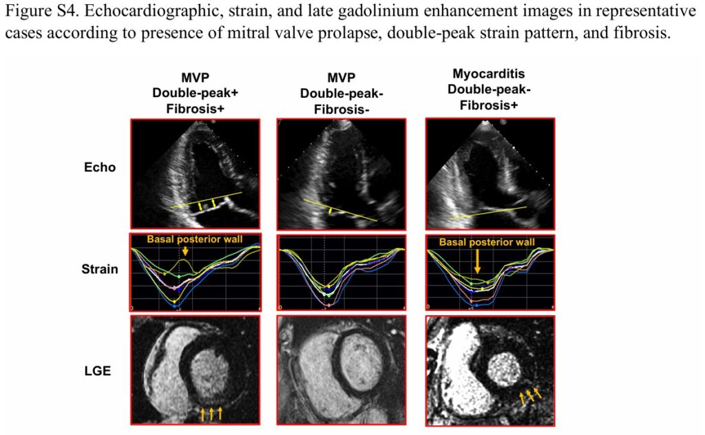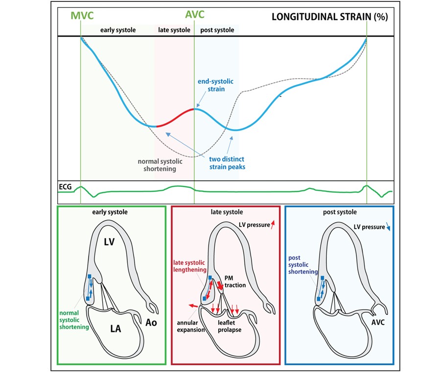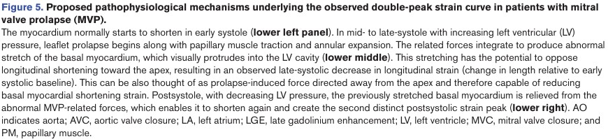 Os achados principais, portanto, são (1) que a mecânica cardíaca anormal na presença de PVM, com diminuição segmentar do strain longitudinal, ocorre no segmento basal da parede ínfero lateral, (2) com o achado do padrão de “duplo pico” (3) se associando significativamente com fibrose miocárdica e (4) conferindo maior risco arrítmico nesses pacientes quando comparado com a presença isolada de fibrose.