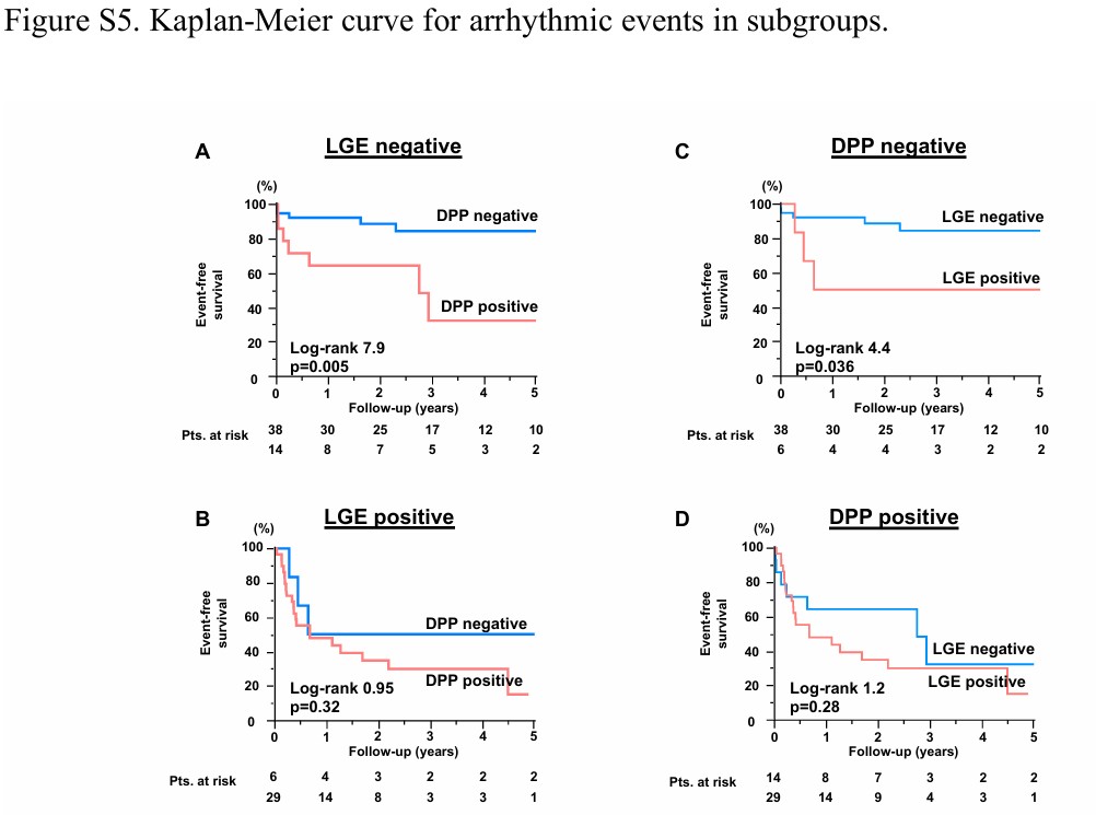 O padrão de “duplo pico” manteve sua associação significativa independente com eventos arrítmicos após ajuste para história de episódios de arritmia ventricular (HR 3.12, 95%IC: 1.25 – 7.78, P = 0.014).