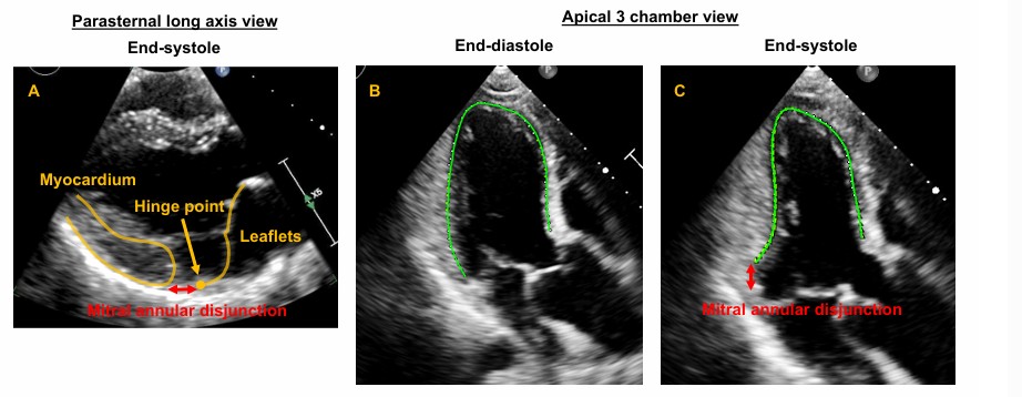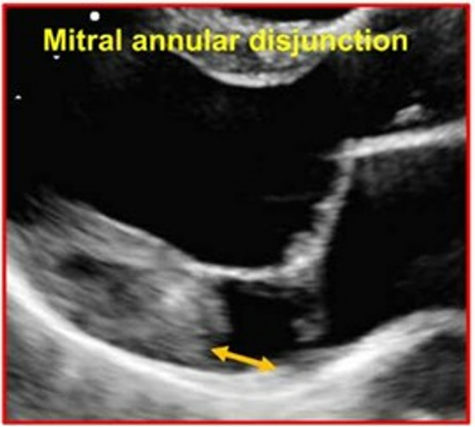 A disjunção do anel valvar (MAD) foi considerada como presente quando houve separação entre a borda posterior do miocárdio e a junção do folheto posterior com o átrio esquerdo (AE).