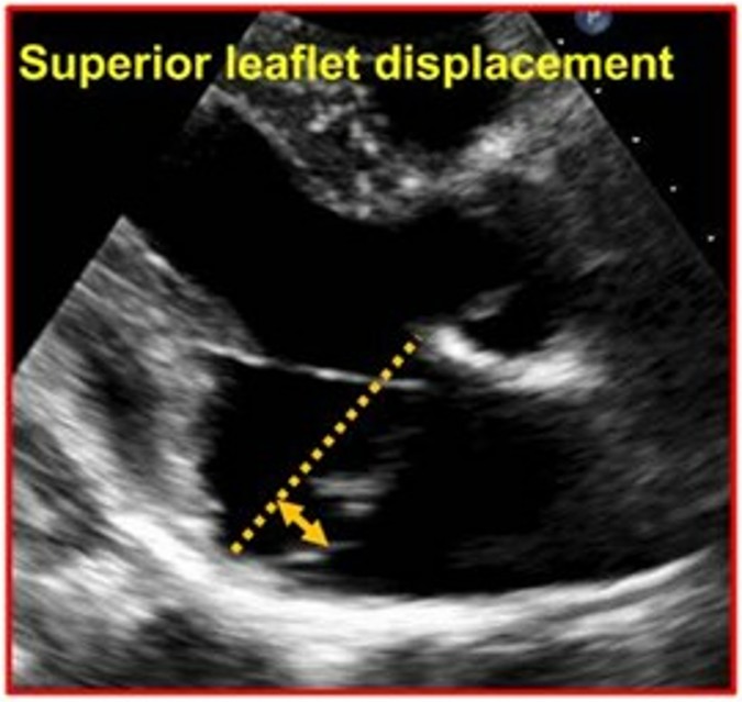O prolapso foi definido como um deslocamento sistólico posterior (superior) do folheto valvar avaliado na janela paraesternal longitudinal eixo longo a partir do plano do anel mitral até o ponto mais superior do folheto prolapsado.