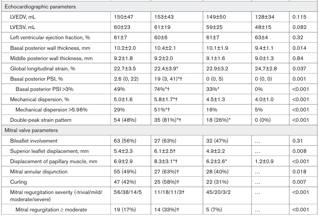 Os critérios de exclusão foram: (1) outra doença cardíaca associada, (2) déficit contrátil segmentar não justificado pela presença do prolapso, (3) imagem inadequada para a realização do strain e (4) idade < 18 anos.