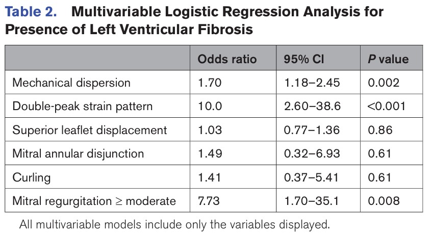 Na análise multivariada, fibrose miocárdica se associou, de forma independente, com a gravidade da insuficiência mitral, dispersão mecânica e o padrão de “duplo pico” pelo strain.