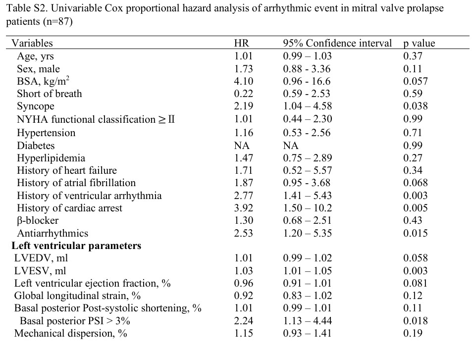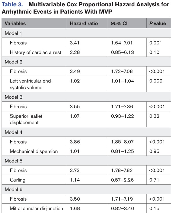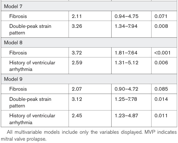 Os eventos arrítmicos se associaram com (1) fibrose miocárdica, (2) padrão de “duplo pico” pelo strain longitudinal, (3) volumes do VE, (4) magnitude do deslocamento sistólico posterior dos folhetos bem como o (5) deslocamento dos músculos papilares, (6) MAD e (7) PSI do segmento basal da parede ínfero lateral.