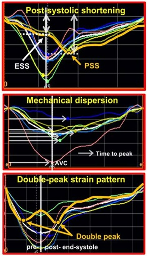 A análise dos traçados também foi realizada (é claro!) caracterizando contração pós-sistólica, índice de dispersão mecânica (PSD), bem com o padrão previamente descrito de dois picos sistólicos distintos do segmento basal da parede ínfero lateral.
