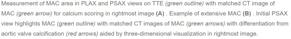 Quando avaliada pela ecocardiografia transtorácica, a graduação da MAC se baseia no envolvimento circunferencial do anel mitral pela janela paraesternal eixo curto. A presença de calcificação leve do anel mitral já é o suficiente para se correlacionar com disfunção valvar e mortalidade.