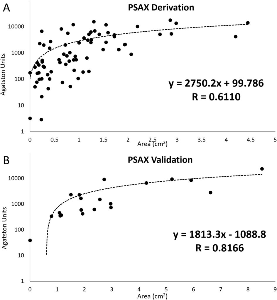Quando as medidas realizadas tanto pelo eixo curto quanto pelo eixo longo foram associadas, a área da MAC e o escore de cálcio tiveram uma correlação mais significativa (R = 0.6520, P < 0.001).