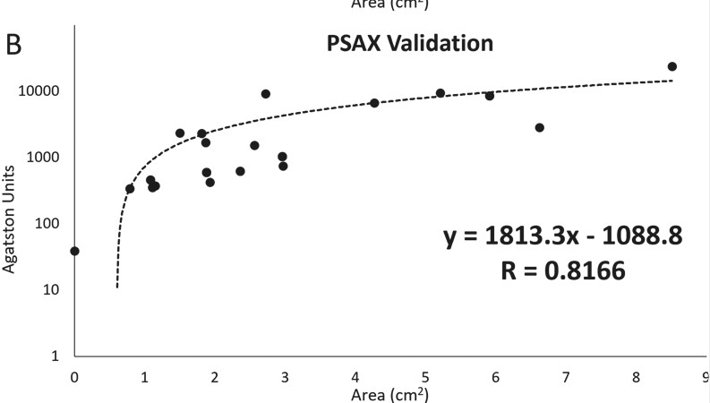 Houve uma melhora da correlação entre a medida da área da MAC com o escore de cálcio pela TC (R = 0.8166, P < 0.001). Da mesma forma, quando as medidas do eixo curto e eixo longo foram agrupadas, houve incremento da correlação comparado com a análise inicial (R = 0.8102, P < 0.001).