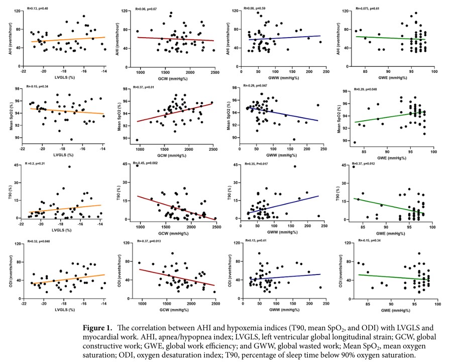 Índices de hipoxemia, como T90 e SpO2 média, se associaram de forma significativa com os parâmetros de trabalho miocárdico. O T90 se associou de forma significativa com o GWW (r = 0.35, p = 0.017), GWE (r = -0.37, p = 0.012) e com GCW (r = -0.45, p = 0.002).