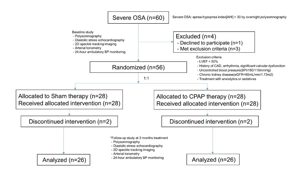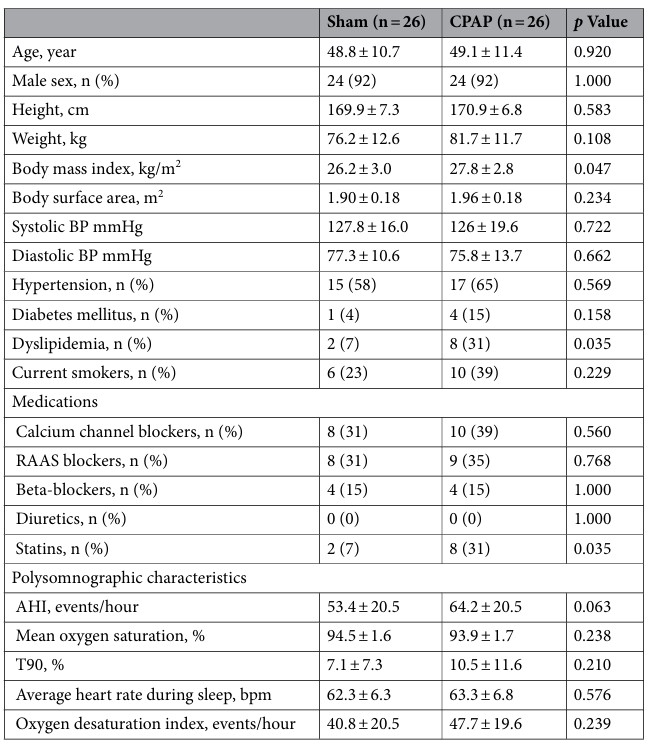 Foram avaliados 52 pacientes, com idade média de 49 anos, sendo 92% do sexo masculino e com com índice de apneia/hipopneia (AHI) médio de 59. Os participantes foram randomizados para tratamento com CPAP ou placebo por 03 meses.