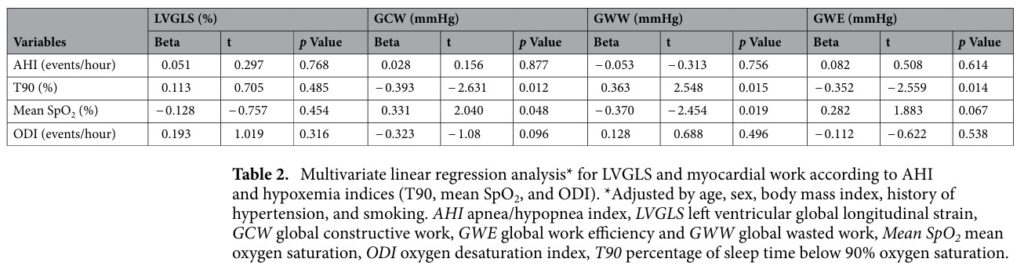 Na regressão de múltiplas variáveis, a análise incluindo sexo, idade, índice de massa corpórea, histórico de hipertensão e tabagismo, tanto o T90 quanto a SpO2 média mostraram correlação significativa com o CGW e GWW. Já a AHI e o ODI não mostraram o mesmo resultado.