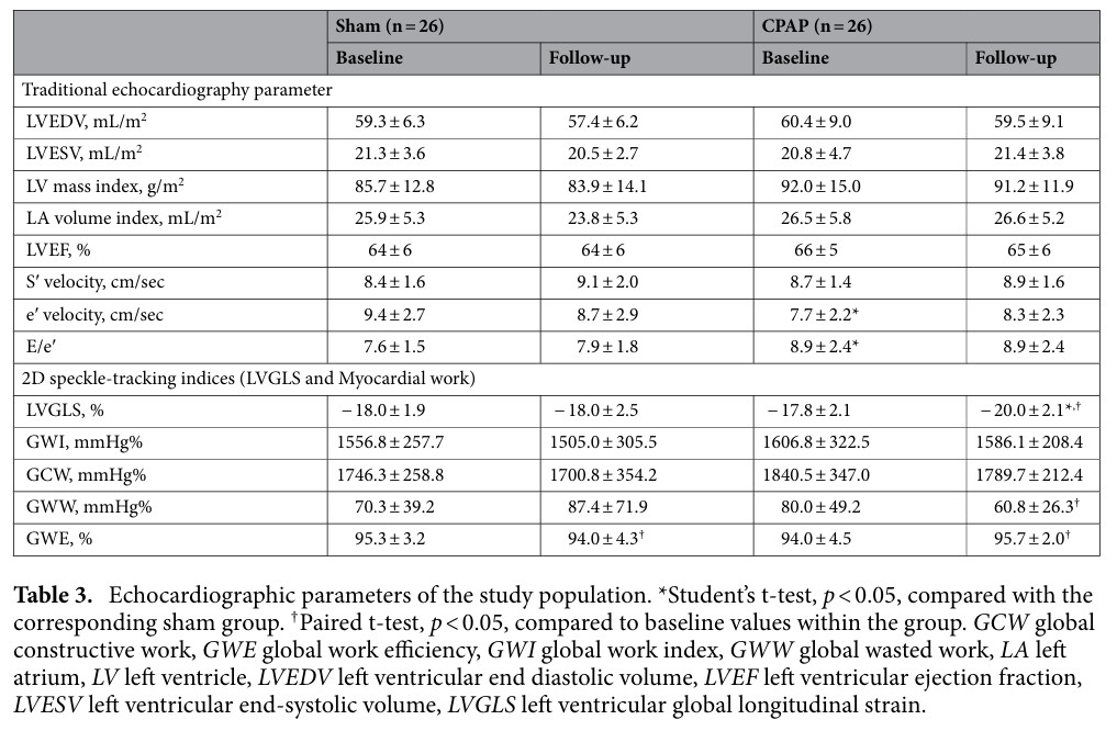 Em relação à terapia com CPAP, não foram observadas diferenças em relação aos diâmetros cavitários do ventrículo esquerdo (VE), índice de massa, volume atrial esquerdo indexado e fração de ejeção (FE) na avaliação antes e após o tratamento.