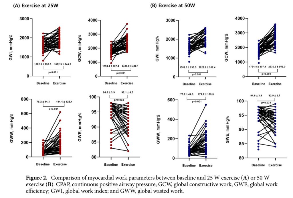 Os achados principais deste estudo incluem que (1) em pacientes com AOS importante, a gravidade da hipoxemia foi o parâmetro que mais se associou com a avaliação da performance cardíaca ao invés do AHI; (2) o tratamento com CPAP, após 03 meses, melhorou a performance do coração determinada pela diminuição do trabalho desperdiçado e melhora da eficiência global; e (3) houve aumento do GWW e redução do GWE durante o exercício naqueles pacientes com AOS importante, com melhora desses parâmetros (ou seja, diminuição do GWW e aumento do GWE) após o período de tratamento com o CPAP.
