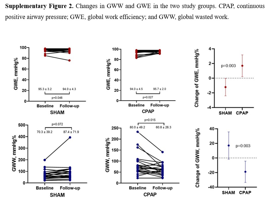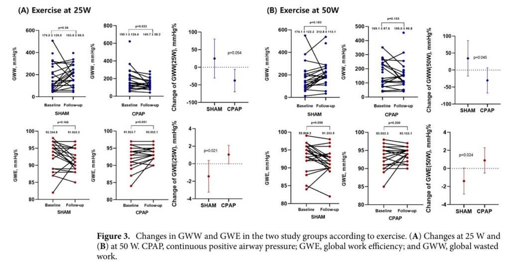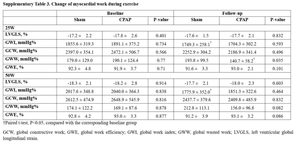 Durante o exercício de 25W, não houve diferenças dos parâmetros de trabalho miocárdico entre os grupos de CPAP e controle, porém após 03 meses de tratamento da AOS, o GWW diminuiu de forma significativa no grupo intervenção comparado com os valores antes do tratamento (190.8 ± 99 x 140.7 ± 58,2, p = 0.023), estando significativamente menor em comparação com o grupo controle (193.8 ± 99 x 140.7 ± 58.2, p = 0.035).