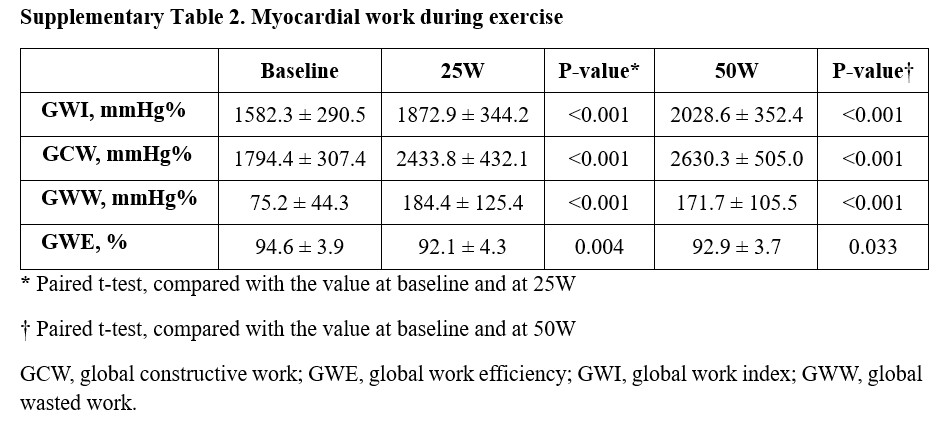Os pacientes também foram avaliados durante exercício físico e em todos eles houve aumento significativo do GWI, GCW e GWW em relação ao valores basais ( em repouso), tanto nas fases de 25W e 50W. Já o GWE apresentou comportamento inverso, com diminuição do valor durante o exercício quando comparado com o valor em repouso.